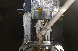 Обслуживание «Хаббла» производилось во время выходов в открытый космос с космических кораблей многоразового использования «Спейс шаттл»[59][60].
