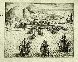 Атака голландскими кораблями португальского флота у берегов Амбона на рисунке 1645 года
