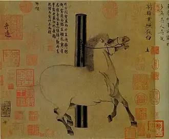 Хань Гань. «Сияние Ночи» ок. 750 г. Метрополитен-музей, Нью-Йорк. На рисунке стоит множество печатей бывших владельцев-коллекционеров, что трактуется в пользу справедливости атрибуции рисунка Хань Ганю.