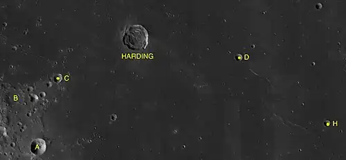 - Сателлитный кратер Хардинг A включен в список кратеров с яркой системой лучей Ассоциации лунной и планетарной астрономии (ALPO)[6].