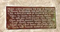 [Шекспир, возможно,] боялся, что его кости будут выкопаны и брошены в близлежащий склеп… но он, вероятно, ещё больше боялся, что однажды его могила будет раскрыта, чтобы в неё поместили тело Анны Шекспир[14][14].