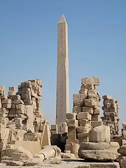 Здесь же, в Карнаке, по приказу царицы были установлены гигантские гранитные обелиски, воздвигнут VIII пилон в храме Амона, сооружено святилище Амона-Камутефа, значительно расширен храм супруги Амона — богини Мут. Она установила четыре гигантских обелиска, два из которых были помещены между пилонами Тутмоса I. Два обелиска Хатшепсут (высотой 29,56 м) рядом с пилоном храма Амона-Ра в Карнаке были самыми высокими из всех построенных ранее в Египте, пока их не заложил каменной кладкой Тутмос III (до наших дней сохранился один из них, цельный блок из красного гранита). При Хатшепсут был вытесан и крупнейший из всех древнеегипетских обелисков, который так и не был закончен, также предназначавшийся для Карнака. Высота его должна была составлять 41,8 метра, а вес — около 1200 тонн[9], что на треть превосходит крупнейшие обелиски, когда-либо возведённые в Египте.
