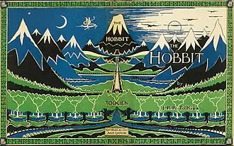 В июле 1937 года Толкин представил издательству собственные проекты обложки и суперобложки для книги[86]. Рисунок для обложки включает в себя изображения дракона, гор, солнца и луны. Две руны (TH) обозначают имена королей Трора и Траина, а руна (D), предположительно, указывает на прародителя гномов Дурина. Суперобложка даёт читателю представление о месте действия книги — на ней изображены горы, лес, город на Долгом озере, Одинокая Гора, дракон и орлы. Одновременное присутствие на небе солнца и луны указывает на день Дурина, во время которого появлялась возможность открыть потайную дверь в Одинокой Горе. Обрамление суперобложки выполнено в виде надписи англосаксонскими рунами: «„Хоббит, или Туда и обратно“ — сочинение Бильбо Бэггинса из Хоббитона о его путешествии, длившемся год, — обработано на основе его воспоминаний Дж. Р. Р. Толкином и опубликовано George Allen and Unwin Ltd.». Оба проекта издательством были приняты[87][39].