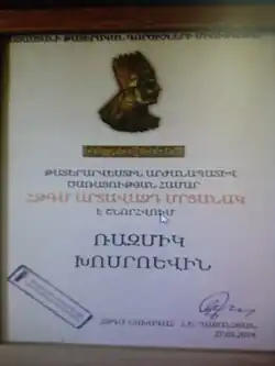 - От имени Министерства культуры Республики Армении награжден государственной золотой медалью..