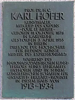 В 20-е годы XX века художник живёт в Берлине и входит в круг художников — экспрессионистов, хотя его работы и отличаются от произведений большинства не столь яркими, приглушёнными красками и романтизированной тематикой. В 1933 году с приходом к власти нацистов мастер был объявлен представителем так называемого «дегенеративного искусства» и подвергался преследованиям. После окончания Второй мировой войны Карл Хофер возглавил Берлинскую академию искусств.
