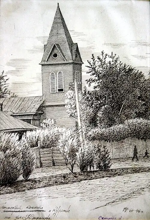 В 1907 году в городскую Думу обратилось Евангельско-лютеранское общество с просьбой уступить ему усадебное место под постройку молитвенного дома. 4 апреля 1907 г. дума согласилась выделить бесплатно 300 квадр. саженей на углу Дворянской улицы и Телеграфного переулка (Советская и Красина). Переговоры тянулись до 1913 года, потому что земля предлагалась в одном квартале с тюремным замком, место это было занято складом дров для тюрьмы и другими хозяйственными постройками. Тюремное ведомство считало эту землю своей собственностью на правах давности владения и добилось того, чтобы под кирху отвели новое место на углу Гоголевской улицы и Компанейского переулка (Гоголя и 1-я Заводская). Здание кирхи было прямоугольное, длиной 15 м, шириной 6 м, высота колокольни 13 м, деревянное, на каменном фундаменте, архитектор Н. А. Юшков. 24 июля (6 августа) 1915 года состоялось освящение кирхи. При кирхе был создан церковный хор, а богослужение велось на немецком, латышском и эстонском языках. 6 июня 1921 года было описано и изъято имущество кирхи[45].