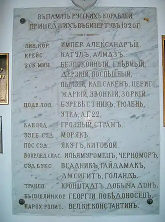 Внутри храма есть мраморная доска с названиями кораблей, пришедших из Крыма в Бизерту. Царские врата завешены Андреевским флагом с корабля «Георгий Победоносец».