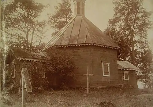 Основной объём храма представлял собой деревянный восьмигранный сруб, который венчал шатер на невысоком восьмигранном основании. Апсида и западный притвор были почти равны и прямоугольной формы[2].