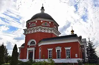 Широкий купол церкви Иверской иконы Божией Матери доминирует в равнинной панораме местности[1].