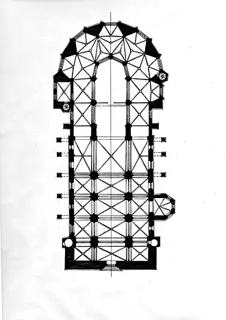 Полукруглая обходная галерея (деамбулатория) имеет трехгранный свод с небольшими розетками, мотив которых растительный. В пресвитерии на пересечении нервюр отсутствуют замковые камни. Пол пресвитерия выше, чем в деамбулатории и нефах.