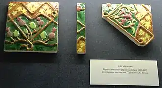 - Летом 1899 года Михаилом Врубелем во время двухнедельного пребывания в Талашкине были выполнены эскизы храма (проект включал собор, колокольню и трапезную[17]), которые также не устроили Тенишеву (в графическом собрании Смоленского музея-заповедника находятся два его эскиза СОМ 432, 433, они представляют северный и западный фасады здания, выполнены акварелью и коричневой тушью на бумаге, наклеенной на картон, были переданы в музей Александром Мишоновым 5 ноября 1929 года)[16]. Этот проект Белогорцев считал наиболее интересным. Роскошный орнамент, вытянутые арки-кокошники с треугольными завершениями, высокие крылечки и множество мелких художественных деталей придавали ему дворцовую помпезность. Проект Врубеля в советские времена экспонировался в Смоленском областном музее имени Н. К. Крупской[17].