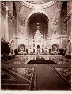 Главный иконостас храма имел форму восьмигранной часовни из белого мрамора. Сооружение венчал позолоченный шатёр. Работы по установке мраморного иконостаса были выполнены за 89 тысяч рублей[75].