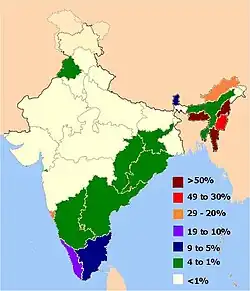 Общее число христиан в Индии, согласно переписи 2001 года составляет 24.080.016 человек или 2,34 % от её населения. Однако, это число не соответствует настоящей численности христиан, так как власти не позволяют индийским гражданам менять религиозную принадлежность после достижения ими школьного возраста. Таким образом, люди, которые обратились к вере в Иисуса Христа и даже были окрещены, могут быть записаны как индуисты.