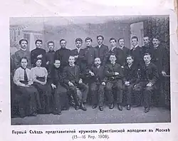 | 1 | Первый съезд представителей кружков христианской молодёжи[14][15][16] | 1908 год, 13-16 апреля, Москва | И. С. Проханов | Конфессиональный состав: евангельские христиане при участии делегации от баптистов. Для объединения христианской молодёжи был создан Совет под председательством И. С. Проханова (товарищ председателя - Ф. М. Троснов), обсуждение проекта Устава. | ![]() |