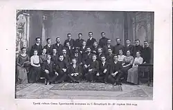 | 3 | Второй съезд Евангельского союза христианской молодёжи[17][18] | 1909 год, 17-19 мая, Санкт-Петербург | И. С. Проханов | Конфессиональный состав: евангельские христиане. Принят Устав Союза молодежи и типовой устав молодёжного кружка при церкви. Решено легализовать Союз под названием «Евангельский союз христианской молодежи». Председателем Союза избран И. С. Проханов, секретарём - Я. И. Жидков. | ![]() |
