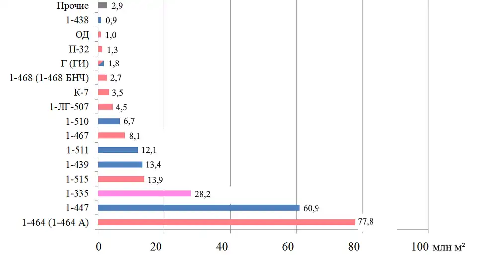 Здания с полным и неполным каркасом Крупнопанельные здания Кирпичные, крупноблочные, кирпично-блочные здания Итого — 229,7 млн м². Данные на 2008 г.