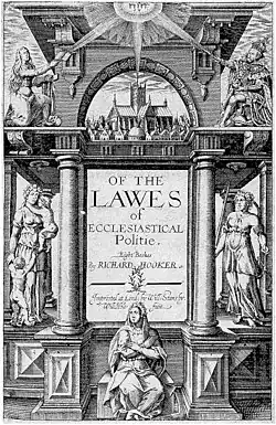 Данная работа является самой известной и состоит из девяти книг, первая из которых увидела свет в 1594 году и четыре последних — посмертно.[7] Хукер призывал найти нечто среднее между позициями католиков и пуритан («Via Media»). Он утверждал, что разум и традиция являются ключевыми элементами в понимании Святых Писаний, а также, что Библия была написана в определенных исторических условиях: «слова должны пониматься в соответствии с теми событиями, по поводу которых они были сказаны».[9]