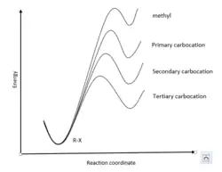 Постулат Хэммонда может быть использован для выяснения структуры переходного состояния реакции SN1. Диссоциация уходящей группы, первое переходное состояние реакции SN1, является скорость-лимитирующей стадией. Стабильность карбокатионов, образующихся в процессе диссоциации уменьшается в ряду четвертичный> третичный> вторичный> первичный, энергия активации реакции увеличивается в этом ряду, поэтому более стабильный и более близкий по величине свободной энергии к реагенту – четвертичный карбокатион. Первичный карбокатион, напротив, имея высокую величину свободной энергии, близкую по величине к энергии интермедиата.