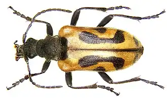 Жук длиной от 9 до 18 мм, имеет чёрную окраску, надкрылья буровато-жёлтые, околощитковое пятно, продольная полоса на диске, загнутая до бокового края, и три краевых пятна чёрные; рисунок изменчив. 5—10-й членики усиков у самцов без кантика, 11-й без придатка. Шов жёлтый[3].