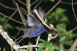 Не образует стай, хотя в подходящей местности встречаются группы из нескольких птиц. Это маленькая птица — всего 20 см в длину. Взрослые самцы темно-синего цвета с более темной головой и спиной. На плечах, надбровьях и лбу имеются ярко-синие пятна. Самка коричневая сверху и каштановая снизу, но имеет ярко-синее пятно на плече, как и у самца.