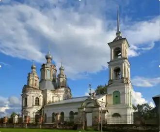 Первая церковь на два престола – летний во имя Троицы и зимний во имя Николая Чудотворца – была построена здесь еще в начале XVIII века[1]. Данных о постройке первого каменного храма нет, однако его существование до XIX в. подтверждается сведениями о том, что в начале XIX в. северная стена зимнего храма покрылась трещинами, шедшими через свод до южной стены[2]. Об этом сообщили владелице села А.Н. Мусиной-Пушкиной и попечителю церкви Н. Глебову, которые и стали ответственными за капитальный ремонт храма, проводившийся на средства прихожан в 1803-1820 гг.