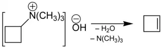 Циклобутен также получается путем элиминирования по Гофману из гидроксида циклобутилтриметиламмония[2]: