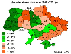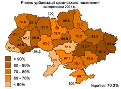 Цыгане проживают во всех регионах Украины, но больше всего их в Закарпатье, и Южной Бессарабии. Почти половина их живёт в городах. В Закарпатье проживают следующие группы цыган: словацкие цыгане (потомки переселенцев начала XX века), кэлдэрары, венгерские цыгане (выходцы из Венгрии), проживающие компактными группами. Наибольшее количество цыган находится в Мукачево (1,4 %), в Виноградовском (0,8 %), Береговском (4,1 %) и Ужгородском (4,1 %) районах Закарпатской области[19]. Русские цыгане (выходцы с юга России в начале XX века), ловари и сервы живут в украинском Полесье. Основными местами компактного проживания являются Прилуки, Нежин, Чернигов и Остёр. Среди цыган Житомирщины больше всего представителей группы ловарей, которые имеют свои компактные поселения в Житомире (район Богуния), селе Тетеревка Житомирского района и в городе Малин. Сервы живут рассеянно небольшими группами среди представителей других этногрупп. Для них характерно проживание в крупных городах Житомирской и Черниговской областей (города Чернигов, Житомир, Коростень, Малин).