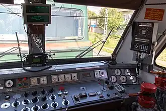 Между лобовыми окнами из триплекса толщиной 3,5 см расположен локомотивный светофор АЛС-200, позволяющий вести поезд с заданной скоростью в автоматическом режиме, учитывая количество свободных блок-участков впереди. Измерение скорости электровоза производит электронный указатель скорости и автоматический регулятор скорости (АРС), вмонтированный в приборную панель пульта управления электровозом, «завязанный» с системами автоматической локомотивной сигнализации (АЛС) и автоведения и имеющий две шкалы измерения скорости до 220 км/ч. Первая — программируемая машинистом через блок АРС на пульте управления, а вторая показывает достигнутую скорость электровоза. Слияние их в единую линию позволяет поддерживать скорость. Управляется автоведение с пульта c кнопками выбора заданной скорости движения от 0, 15, 25, 40, 50 … 180, 200 км/ч и переключателями работы в тяговых режимах, ходе, выбеге, с АЛС или без неё. Нажатие соответствующей кнопки определяет необходимую скорость, поддерживаемую в автоматическом режиме.
