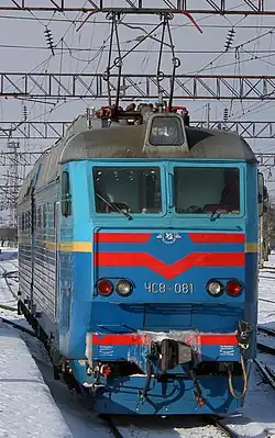 ![]() ЧС8-016 в сине-серой окраске УЗ с жёлтой полосой на станции Винница | |