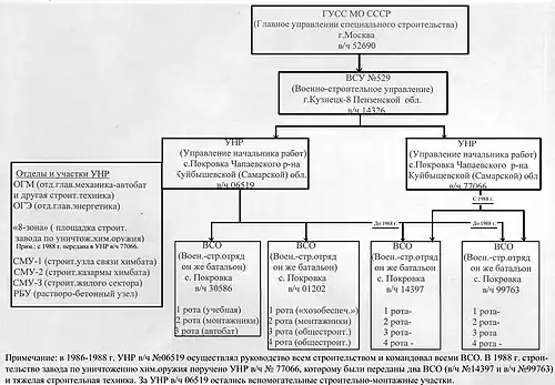 В свою очередь УНР командовало приданными им военно-строительными отрядами (ВСО), они же военно-строительные батальоны, комплектуемые военнослужащими срочной службы. На химплощадке размещались четыре ВСО: в/ч № 30586 (командир подполковник Байболатов), в/ч № 01202 (командир майор Гилязов И.Г.), в/ч № 14397 (командир подполковник Каверда В.), в/ч № 99763 (командир майор Будник, с 1988 капитан Ермаков).