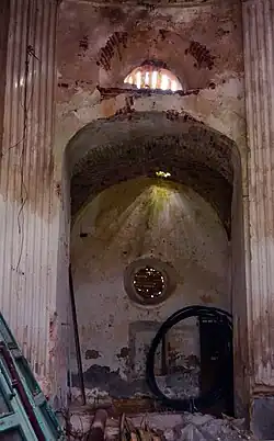 Внутреннее пространство основного объема представляет собой круглый зал, перекрытый закрытым куполом, не сохранившимся до нашего времени. Стены усеяны рифлеными пилястрами и отделаны профилированными карнизами с сандриками . Входной объем перекрыт крестообразным сводом, а алтарная часть перекрыта цилиндрическим сводом . Последний открыт в основной объем арочным сводом, как и хоры, расположенные на втором этаже притвора.