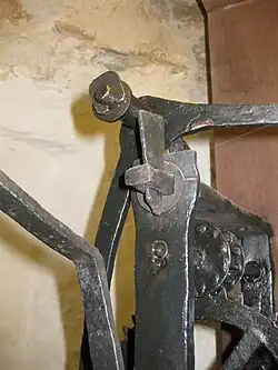 Часы собраны в прямоугольной раме из кованого железа, верхний и нижний брусья рамы прикреплены к стойкам железными клиньями. Высота рамы — 115 см, сечение брусьев — 4×1,5 см².