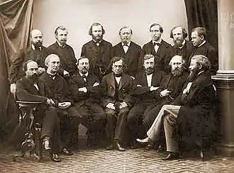 Стоят: Р. Э. Ленц, Н. А. Меншуткин, А. С. Фаминцын, О. И. Сомов, Ф. Ф. Петрушевский, Д. И. Менделеев, А. Н. Коркин