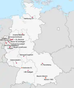 | 5 | Айнтрахт (Франкфурт-на-Майне) | 34 | 13 | 12 | 9 | 61 − 57 | +4 | 38 | Кубок обладателей кубков |