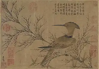 - «Удод на ветке бамбука». Короткий свиток. Бледная тушь и подкраска на шелку. Подписан. Гугун, Пекин;