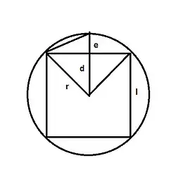 Также Чжао Юцинь пытался точнее рассчитать число π. Для этого разработан соответствующий алгоритм. Он поместил квадрат в круг, обозначив длину радиуса, равное "r", а "l" — это длина стороны квадрата. После чего Чжао нарисовал от центра круга и квадрата перпендикулярную линию "d" до стороны квадрата "i", тогда предположил, что линия "e"=r-d. Отсюда: