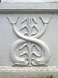 Массивные устои из гладко обтёсанного серого пудостского известняка выдвинуты в русло реки, на них расположен сам мост с оградой из пересекающихся овалов, скреплённых небольшими розетками. Чугунные постаменты, к которым крепится решётка, по бокам украшены барельефами с дельфинами, повторяющими метопы Храма Дружбы; на них стоят широкие вазы[1][3].