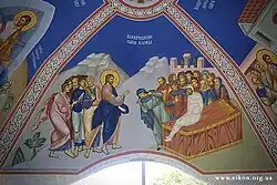 Воскрешение дочери Иаира (Капернаум) Мф. 9:18-26; Мк. 5:21-43; Лк. 8:41-56 У начальника синагоги Иаира была при смерти единственная дочь. Он пришёл ко Иисусу Христу и просил его, говоря: «дочь моя при смерти; приди и возложи на неё руки, чтобы она выздоровела и осталась жива». Видя его веру, Иисус пошёл с ним, но на пути встретил слугу, который сообщил Иаиру «дочь твоя умерла; не утруждай учителя», но Иисус сказал: «не бойся, только веруй, и будет спасена». Подойдя к дому и видя плачущих людей Иисус сказал им: «не плачьте; девица не умерла, но спит», но люди не поняли его слов и стали смеяться над ним. Взяв с собою только родителей девушки и трёх апостолов — Петра, Иакова и Иоанна, Иисус вошёл в комнату, где лежала умершая девица и взяв её за руку сказал: «талифа куми», что значит; «девица, тебе говорю, встань!». И девица тотчас встала и начала ходить. Иисус велел дать ей есть и запретил её родителям разглашать о происшедшем, но слух об этом разнесся по всей стране.