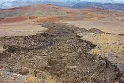 | Тектоно-сейсмологические | Древний сейсмооползень на Курайском хребте | Следы землетрясений в засушливом климате геопарка хорошо сохраняются на протяжении длинного временного периода, не подвергаясь значительному эрозийному воздействию климатических факторов, что позволяет изучать их максимально наглядно. | ![]() |