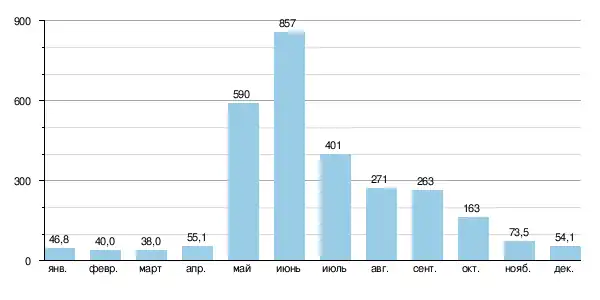Средний расход воды (м³/с) реки Чуя по месяцам с 1961 по 1990 гг.