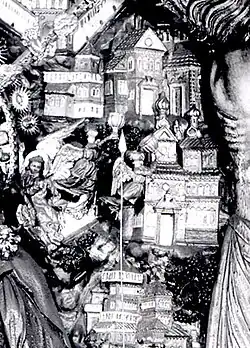 Прообразом дворцов земного Иерусалима в ансамбле «Шумаевского креста» стали московские боярские палаты и дворцы, построенные для царя Алексея Михайловича в Кремле и в селе Коломенском. Иерусалим Небесный изображён в виде идеализированной градостроительной схемы Москвы XVII века.[21]
