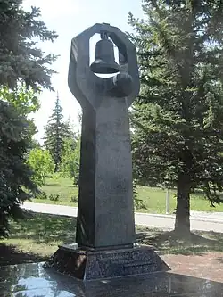 | Молчащий колокол — Памятник павшим на полях сражений. Надпись на монументе: «Застыли слёзы тех, кто плачет на Руси. Умолк и колокол.» Скульпторы — братья Андрей и Сергей Щербаковы. Парк Победы, Саратов. Торжественное открытие 9 мая 2000г.[17] | |