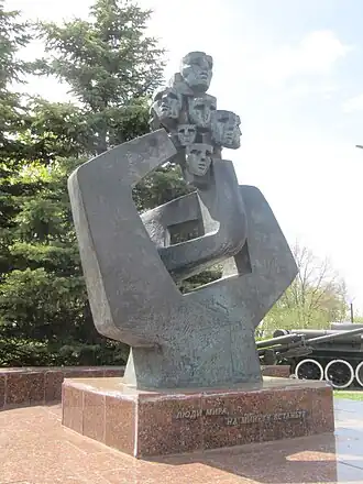 Памятник малолетним узникам фашизма. Надпись на пьедестале: «Люди мира, на минуту встаньте». Парк Победы, Саратов. Торжественное открытие 22 июня 2003г.[20] |