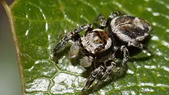 Среднего размера паук-скакунчик. Длина тела самок 6—8 мм, самца — 5 мм. Верхняя сторона головогруди самца в передней половине светло-коричневого, в задней половине — тёмно-коричневого или чёрного цвета. За глазами и по бокам головогруди расположены широкие, светло-бежевые, либо белые полосы. Брюшко в центре светло-коричневого цвета, обрамлено чёрной и белой полосами. Фронтальная область глаз покрыта светлыми волосками. Педипальпы покрыты длинными, светлыми волосками.