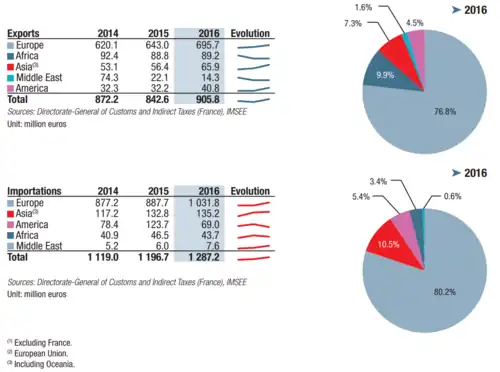 | Партнёры по импорту | Европа - 73,17 % Азия - 11,35 % Америка - 10,84 % Африка - 4,12 % Средний Восток - 0,53 % (2015) |