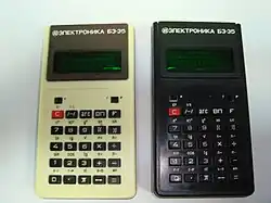 Электроника Б3-35 — советский инженерный 8-разрядный карманный калькулятор. Выпускался с 1979 года и продавался за 105 рублей, после 1981 года - за 65 руб. Предназначен для выполнения инженерных расчётов в хозяйстве и быту. Калькулятор выполняет четыре арифметические операции, вычисление натуральных и десятичных логарифмов и антилогарифмов, прямых и обратных тригонометрических функций, обратных величин, факториала, вычисления с двухуровневыми скобками, возведение в степень, извлечение корней и операции (умножение и деление числа в памяти[1][2]) с памятью. Прототипом являлся Hanimex ESR Master.[3]