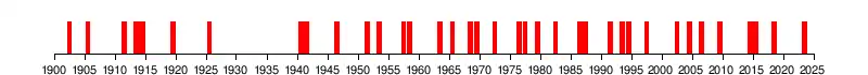 Характерное время осцилляции — от 3 до 8 лет, однако сила и продолжительность Эль-Ниньо в реальности сильно варьируется. Так, в 1790—1793, 1828, 1876—1878, 1891, 1925—1926, 1982—1983 и 1997—1998 годах были зафиксированы мощные фазы Эль-Ниньо, тогда как, например, в 1991—1992, 1993, 1994 это явление, часто повторяясь, было слабо выраженным. Эль-Ниньо 1997—1998 годов было настолько сильным, что привлекло внимание мировой общественности и прессы. Тогда же распространились теории о связи Южной осцилляции с глобальными изменениями климата. С начала 1980-х Эль-Ниньо возникало также в 1986—1987 и 2002—2003 годах.