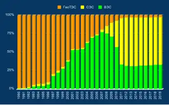 Значительный рост использования возобновляемых источников энергии (ВИЭ) в 2019 г. в сравнении с 1990 г. в производстве первичной энергии более, чем в 4,2 раза, в преобразовании на электростанциях и отопительных установках с 5,5 млн. toe в 1990 г. до 18,6 млн. toe в 2019 г., обеспечен, прежде всего, за счет опережающих темпов ввода солнечных (СЭС) и ветряных электростанций (ВЭС)[4]