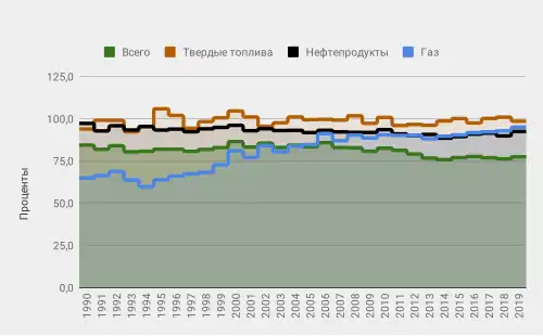 Итоги 2019 года в сравнении с 1990 г. в целом следует оценить позитивно, хотя и отмечается снижение потребления энергоносителей в промышленности. На преобразование энергоносителей на электрических станциях и отопительных установках в 2019 г. пришлось 38,8 % от преобразуемых энергоносителей.