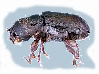 Взрослые насекомые длиной 2—4 мм, их тело короткое, цилиндрическое, коричневое или чёрное. Голова широкая и выдающаяся; у самцов на голове имеется явная выемка или лобовой желобок. У самок широкая, приподнятая кверху переднеспинка с поперечной бороздкой в передней половине. Брюшко округлённое. Молодые (незрелые) жуки по мере развития меняют свой цвет от желтовато-белого через красновато-коричневый до тёмно-коричневого или чёрного[4][2].